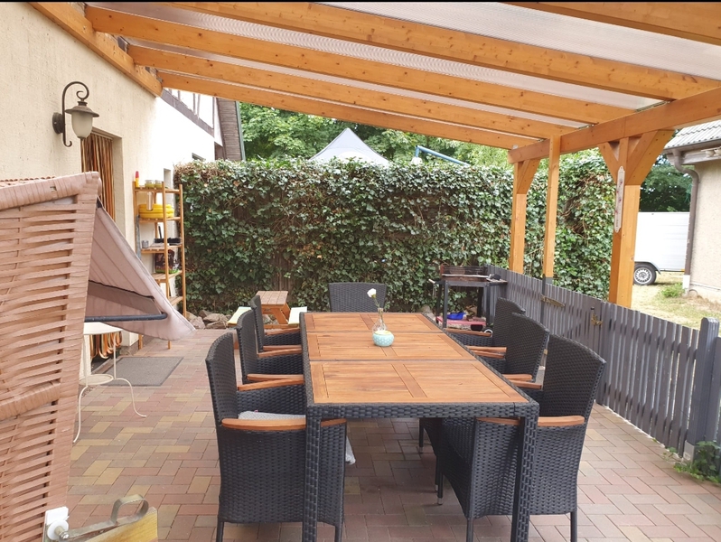 Ein gekennzeichneter Parkplatz steht zur Verfügung. Ferner gehört zu der Wohnung eine eingezäunte und überdachte Terrasse mit Grillmöglichkeiten und Gartenmöbeln.